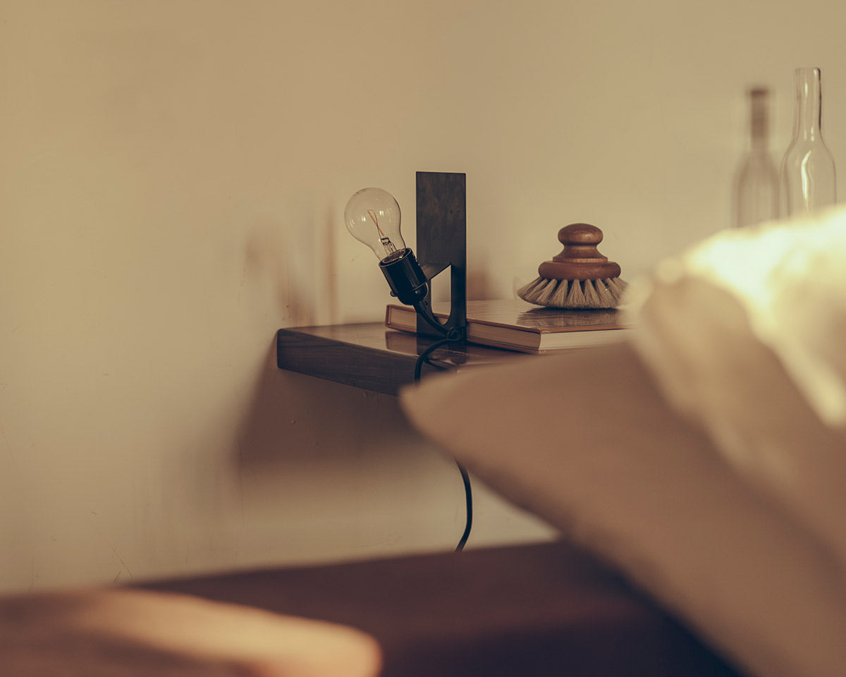 The Library Lamp is composed of a combination of folded metal body and light holder to create a bookend. It can be placed on the shelf or the desk, either as a bookend or as a free-standing fixture.